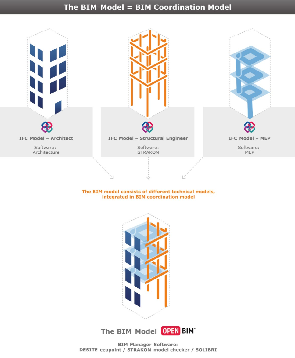 Om een BIM-proces optimaal te ondersteunen, zijn softwareoplossingen nodig die BIM ondersteunen. Alle projectpartners gebruiken hun eigen gespecialiseerde toepassingen. We kunnen van het verleden leren dat BIM niet werkt met slechts één model dat alle planners tegelijkertijd gebruiken. In plaats daarvan houden alle projectpartners hun eigen model bij in de respectievelijke applicatiesoftware. Deze modellen moeten echter wel slim op elkaar worden afgestemd.